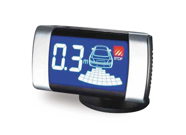 Parkovací asistent Steelmate PTS400V5 so 4 snímačmi a LCD displejom V5 s akustickou a hlasovou signalizáciou určený pre inštaláciu do zadného nárazníka vozidla.