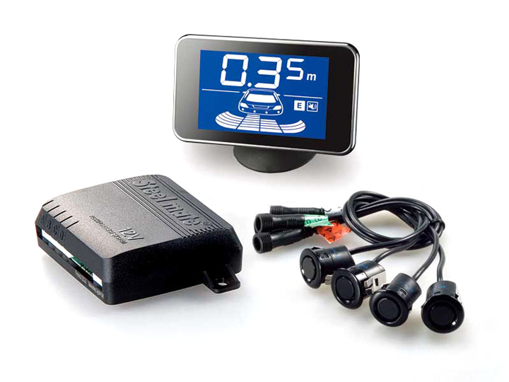 Parkovací asistent Steelmate PTS400V6 so 4 snímačmi a LCD displejom V6 s akustickou a hlasovou signalizáciou určený pre inštaláciu do zadného nárazníka vozidla.